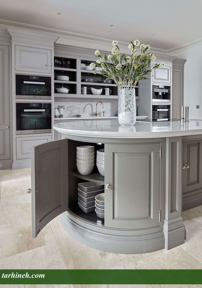 در برخی از فضاهای آشپزخانه به ویژه آشپزخانه های بزرگ از طرح منحی جزیره استفاده می شود . مزیت هایی دارد که از جمله تسلط شما به قسمت های مختلف جزیره بیشتر میشه و حس پویایی محیط را القا می کند . در ضمن یک ایده بسیار زیبا نیز می تواند باشد .